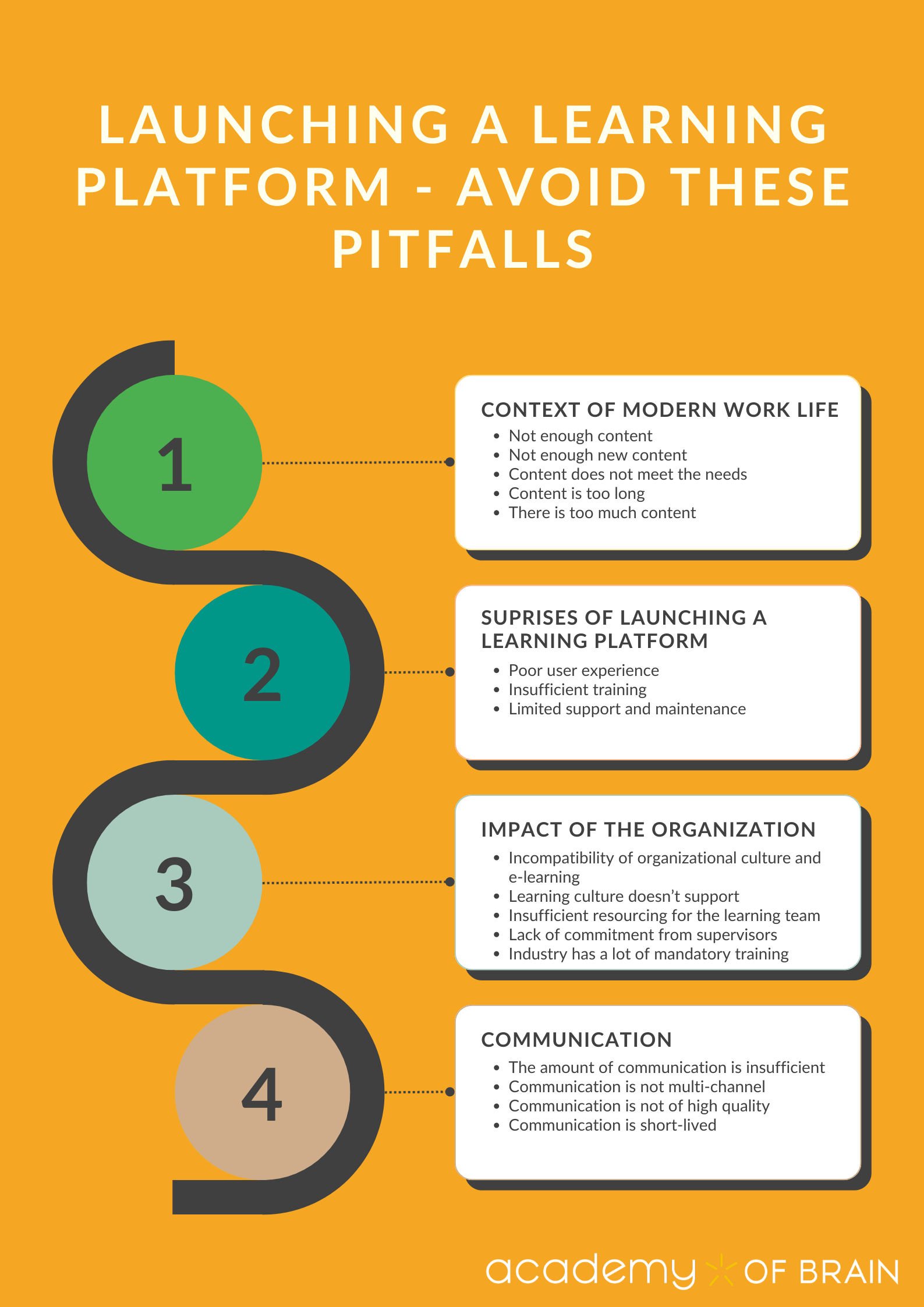 Pitfall #6: Too Much Content. Learning platform provider Acorn identified excessive course offerings and the resulting information overload as the second biggest barrier to effective learning in their research. The third biggest barrier was employees’ poor understanding of which courses they should take.